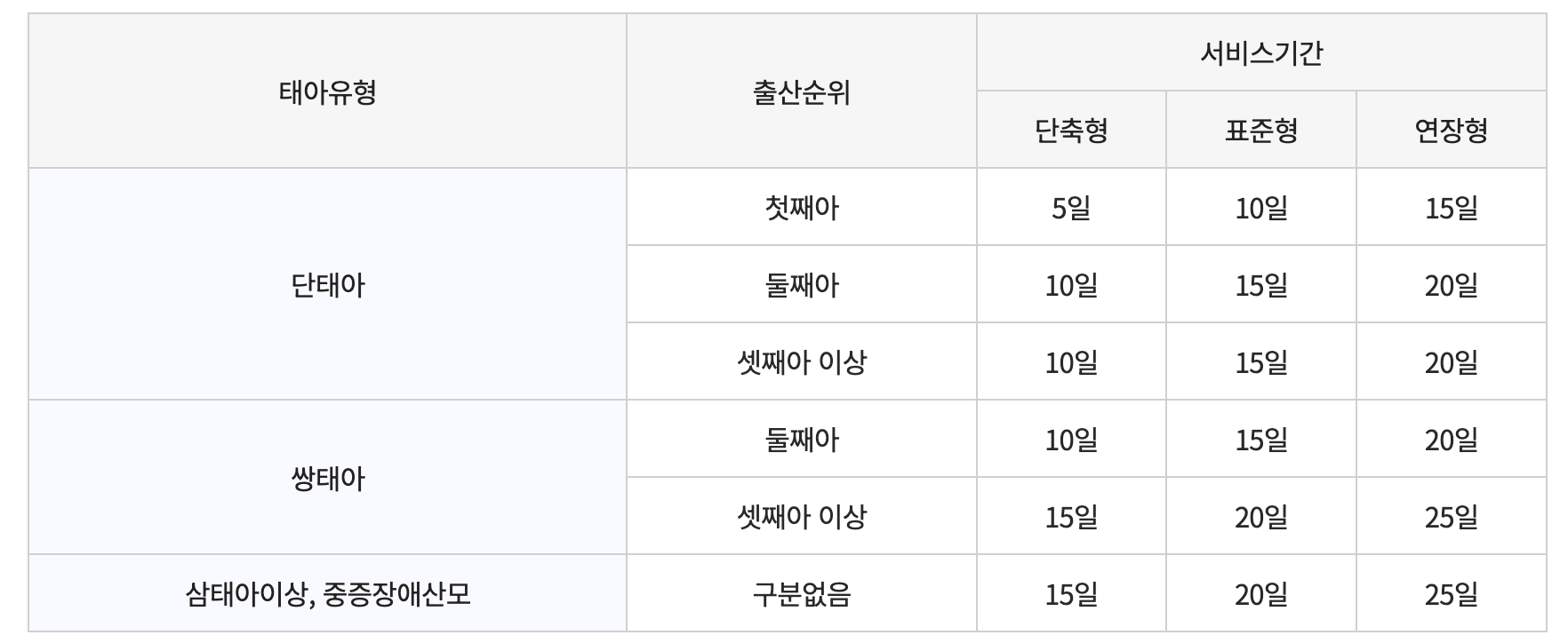 - 지원 기간: ① 1일 8시간 근무(휴게시간 1시간 제외)하며, 07:00~22:00 기간 중 이용자와 제공 기관 간 계약에 의거 자율결정 ②출산일로부터 60일 이내 서비스 완료 ③미숙아 선천성 이상 아동의 경우는 상당 기간 입원(인큐베이터 활용)하므로 퇴원일을 기준으로 30일 이내까지 서비스 제공이 완료되어야 함