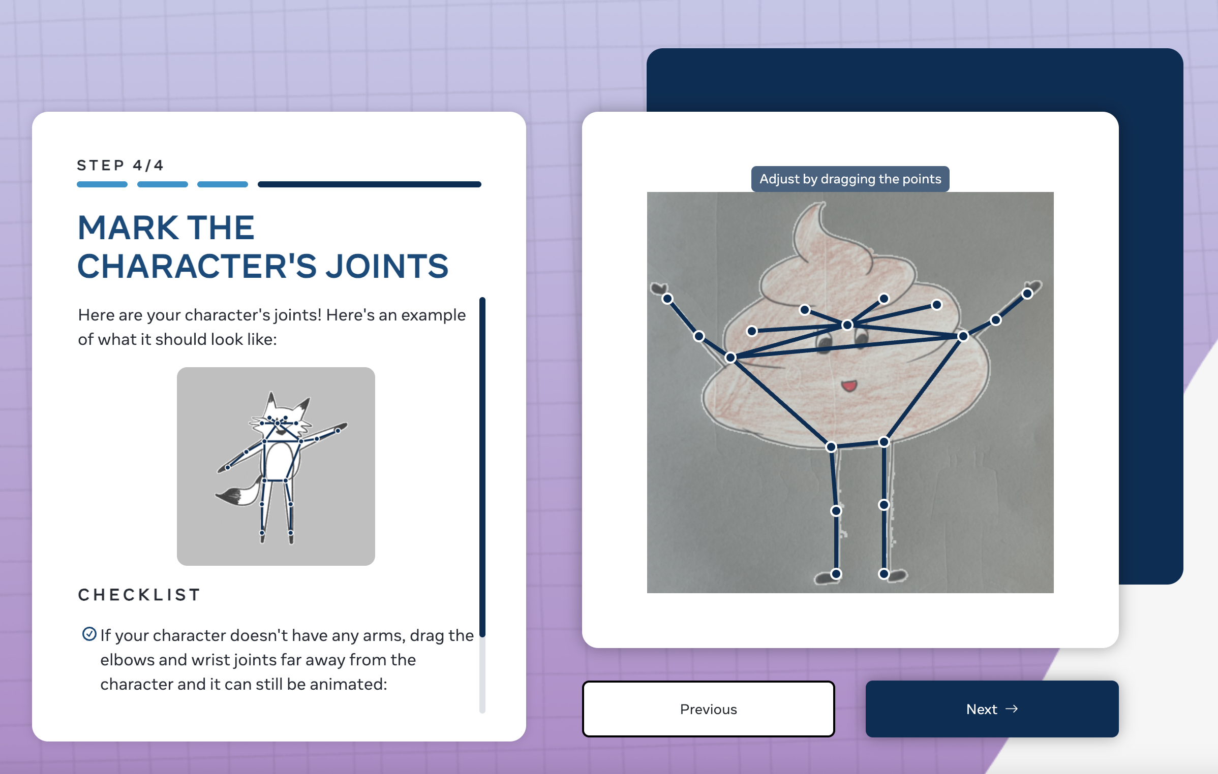 AI가 자동으로 캐릭터의 관절, 팔, 다리 위치 등을 파악하고 사람처럼 움직일 수 있는 뼈대를 만들어 준다. 가끔 AI가 잘못된 위치에 뼈대를 넣을 때도 있다. 그럴 땐 직접 뼈대를 움직이면서 조절할 수 있게 되어 있어서 내 그림에 딱 맞는 동작을 만들 수 있다.