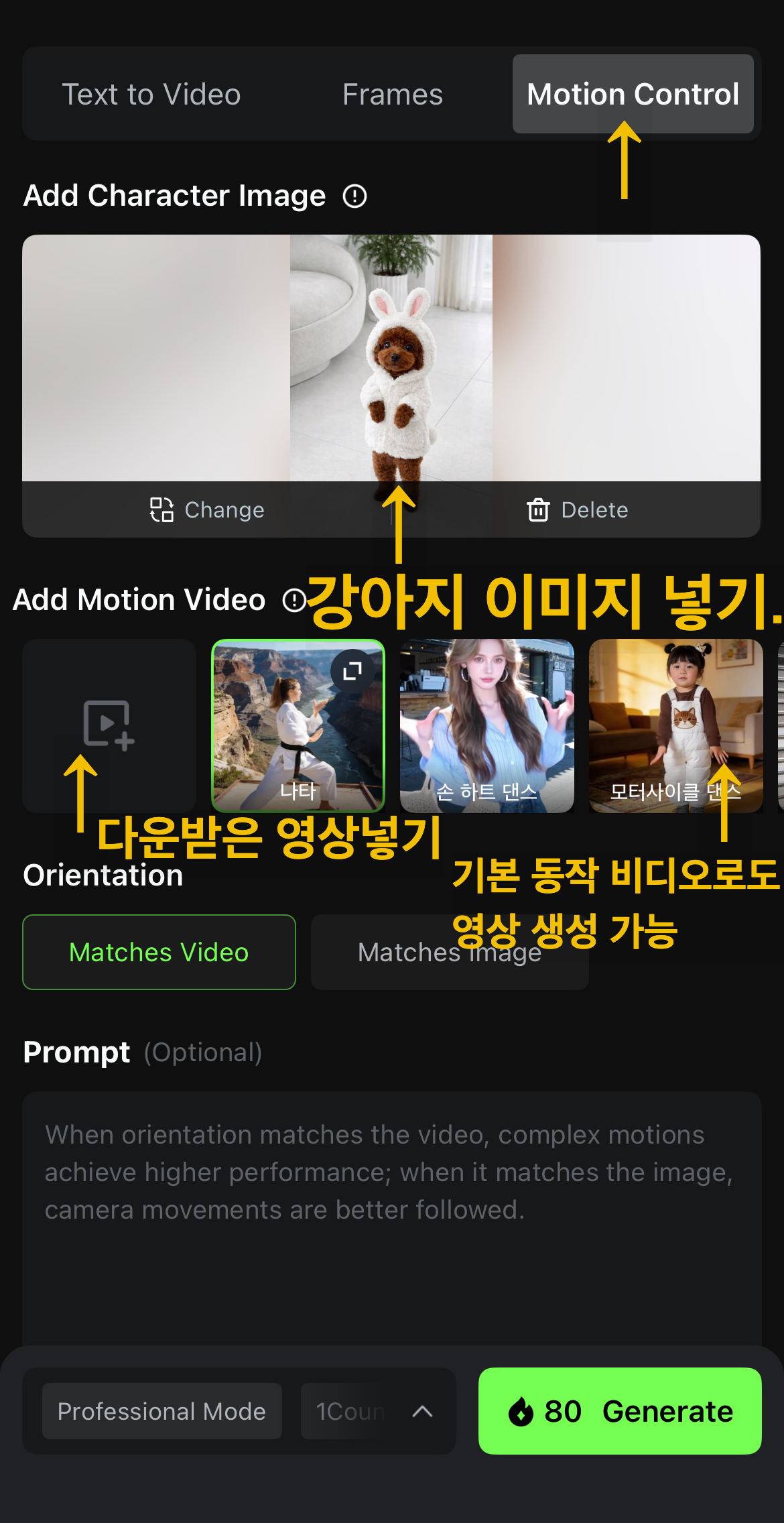 4. 클링어플을 이용해서 사진과 예시 영상을 넣고 생성버튼 누르기