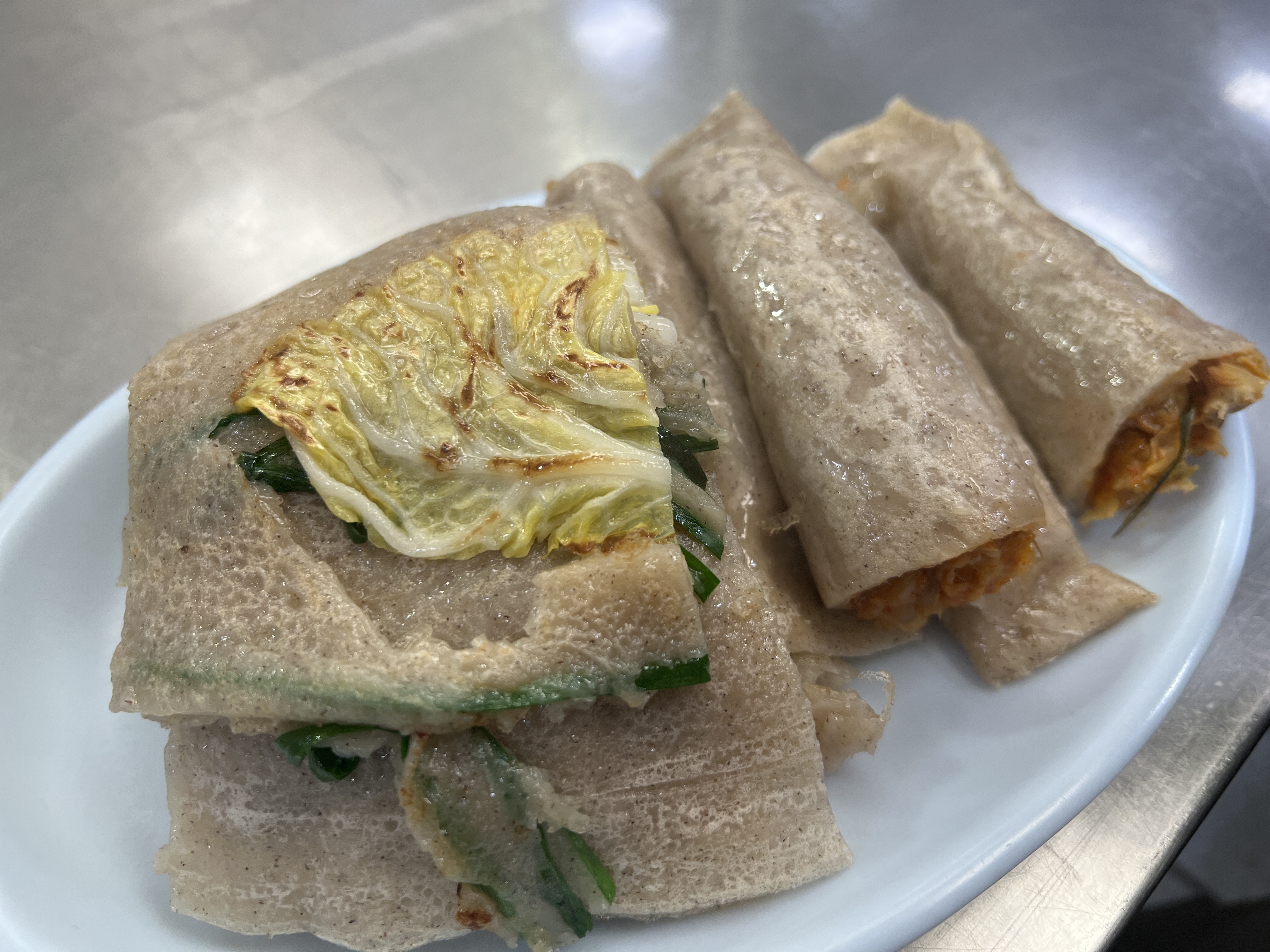 - 메밀전병은 안에 들어있는 김칫소가 약간 매콤하면서도 중독성이 있어 계속 손이 간다.