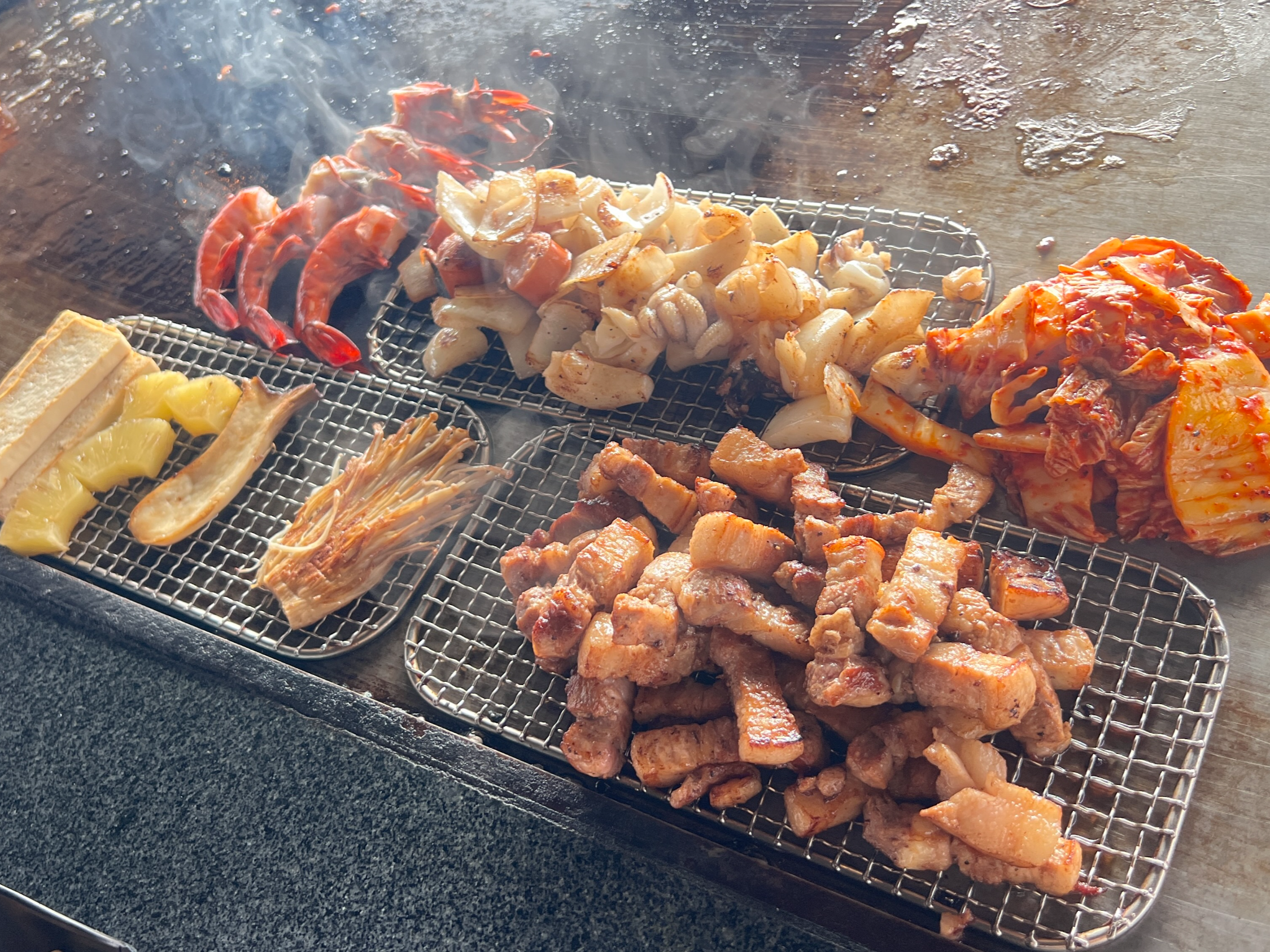 새우, 갑오징어, 버섯, 양파, 김치 등 다양한 해산물과 채소들을 함께 구워준다.